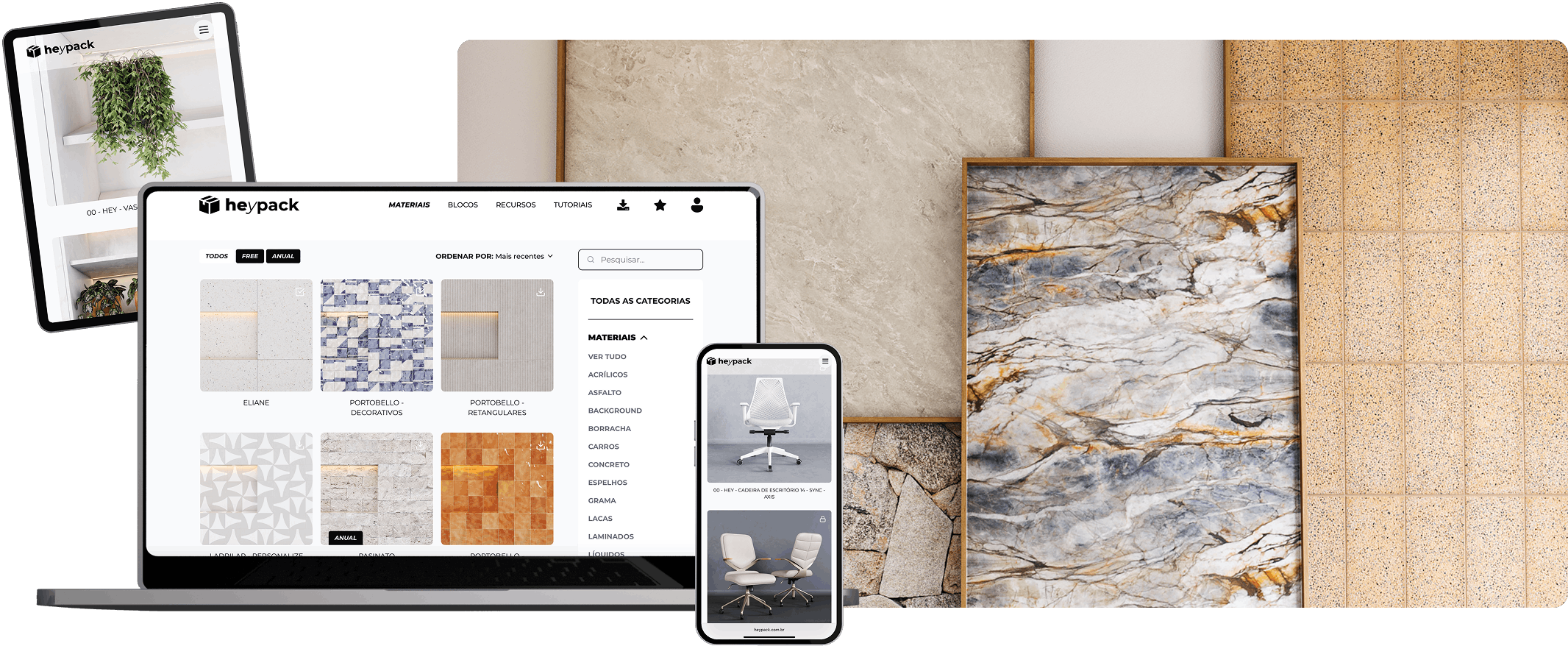 Assets organizados por categorias, disponíveis em uma plataforma prática e intuitiva.